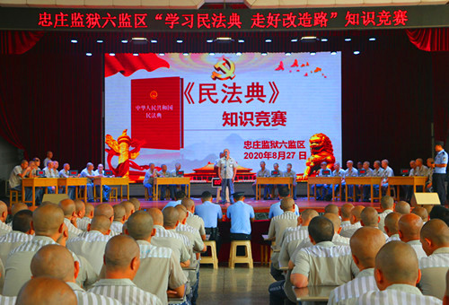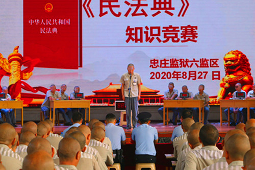 8月27日,忠庄监狱六监区在狱内多功能厅组织罪犯开展主题知识竞赛,对近两个月来的普法宣传工作进行阶段性成效检验。