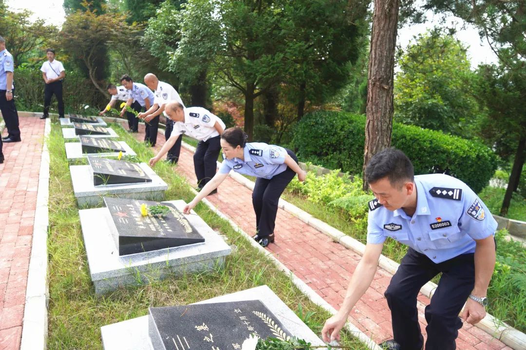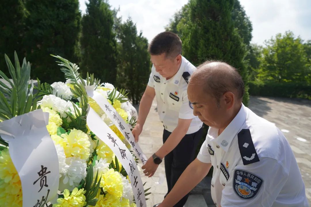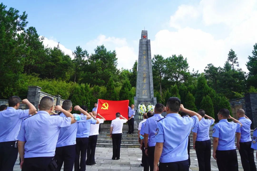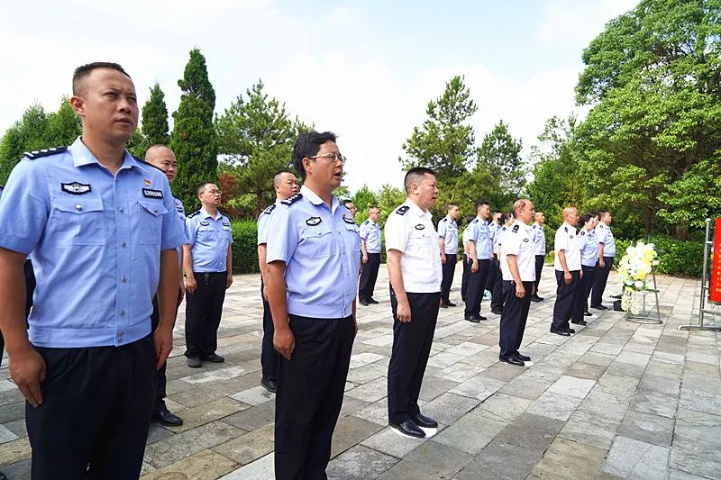 红军烈士纪念碑前庄严肃穆,民警们警容严整,4名民警迈着整齐的步伐把花圈摆在纪念碑前,全体民警向长眠于地下的烈士们默哀致敬,表达对革命先烈的无尽怀念和哀思。