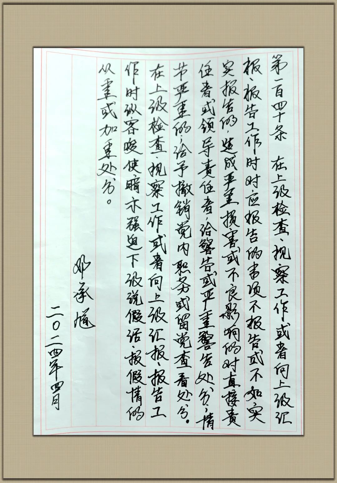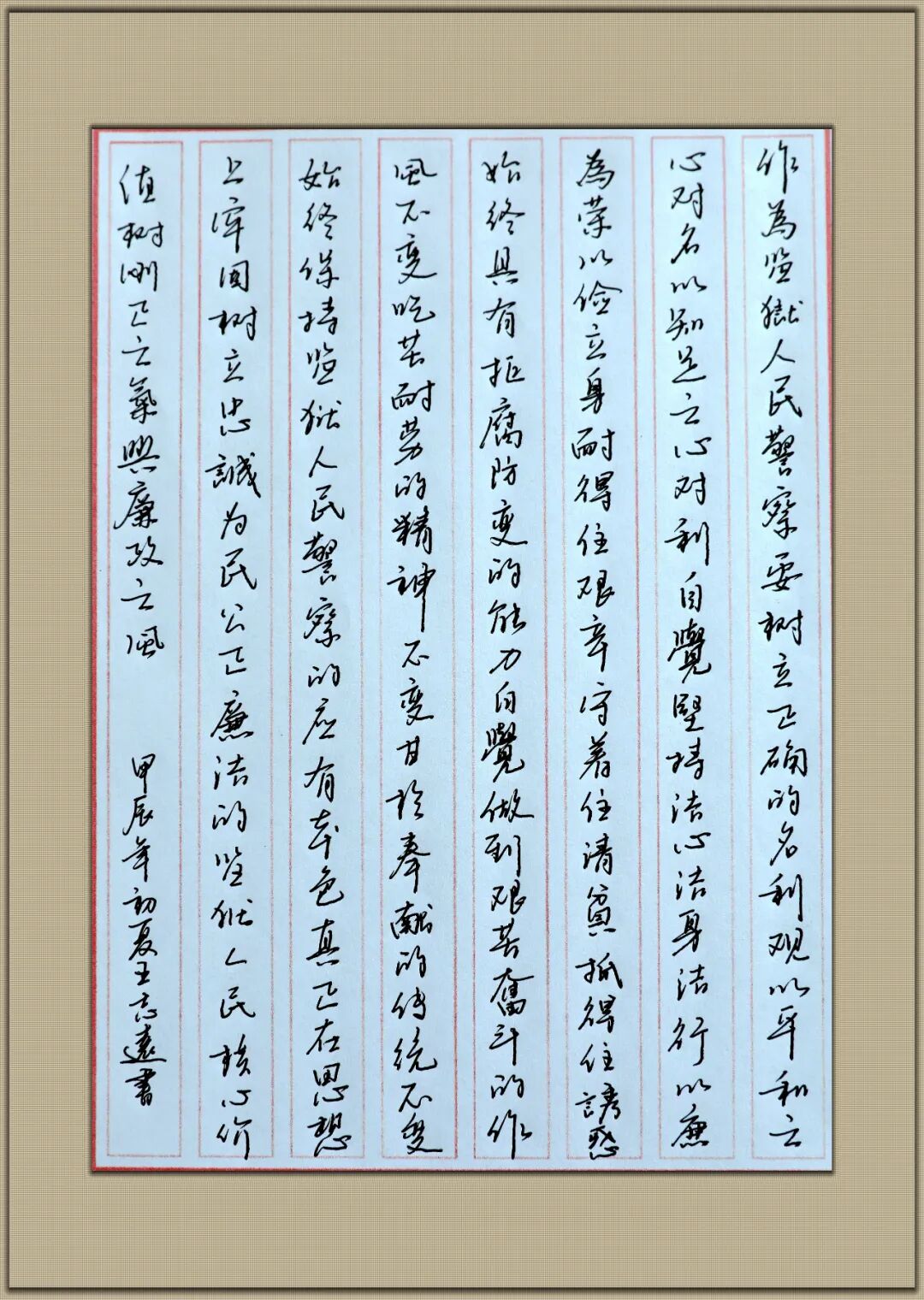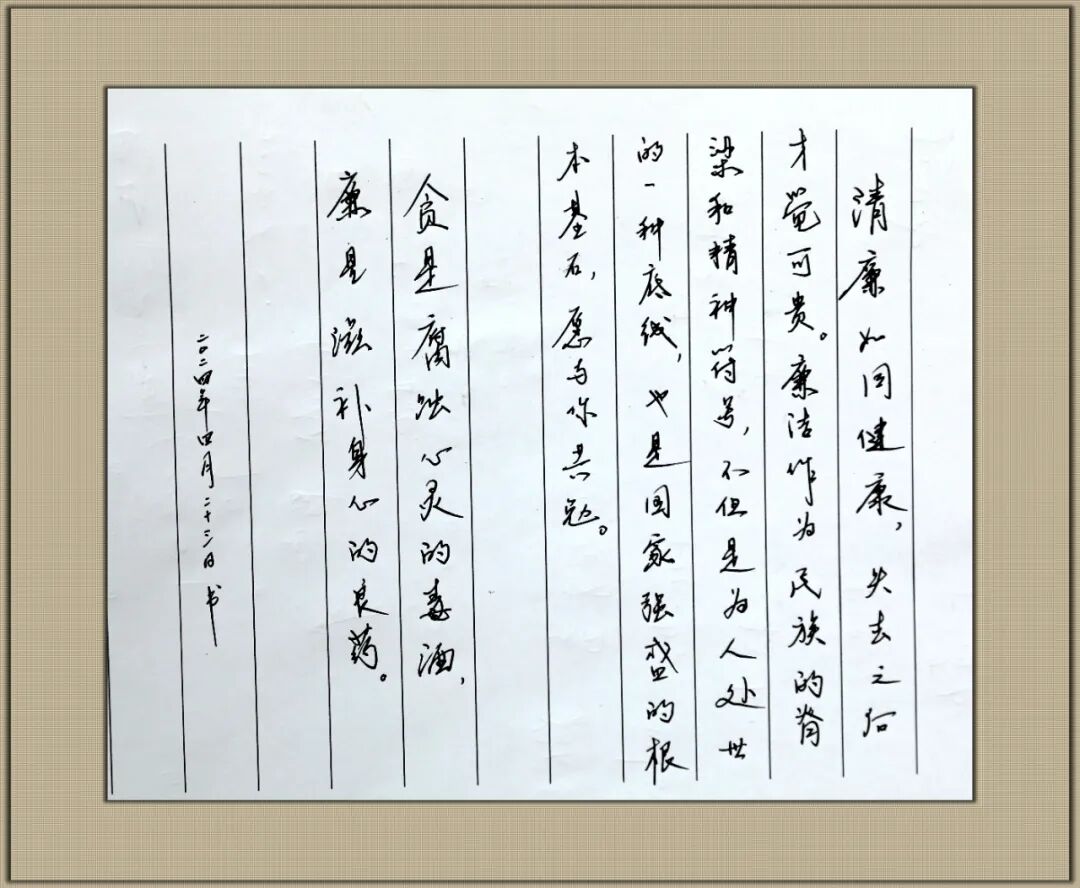 为扎实开展党纪学习教育,加强党风廉政建设,提升党员民警廉洁自律意识,突出“风雅高致、高风亮节”“清正廉洁、求真务实”的廉政文化,营造崇廉尚洁的浓厚氛围。连日来,黔北监狱面向全监征集“廉洁文化”书画作品,广大民警热情高涨,积极投稿。下面,我们一起来看看监狱民警在字里行间的“廉洁”~