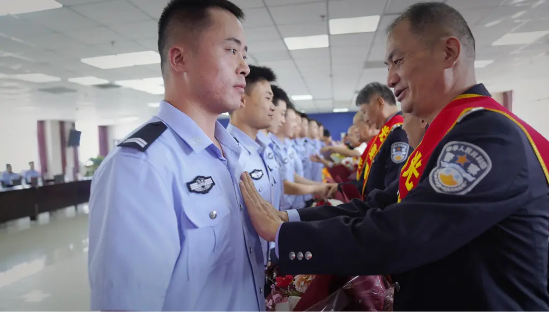 在热烈的掌声中,新招录民警们向退休前辈献上鲜花。退休民警们为新招录民警佩戴警号,并将警旗庄重地交到新警代表手中。
